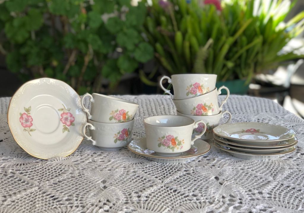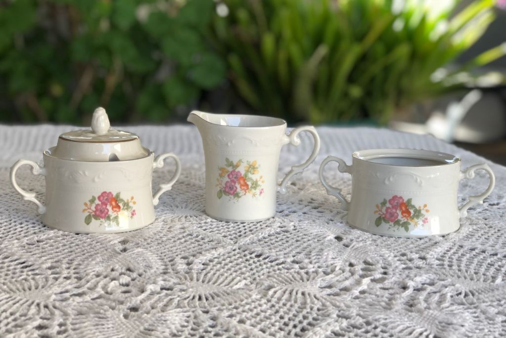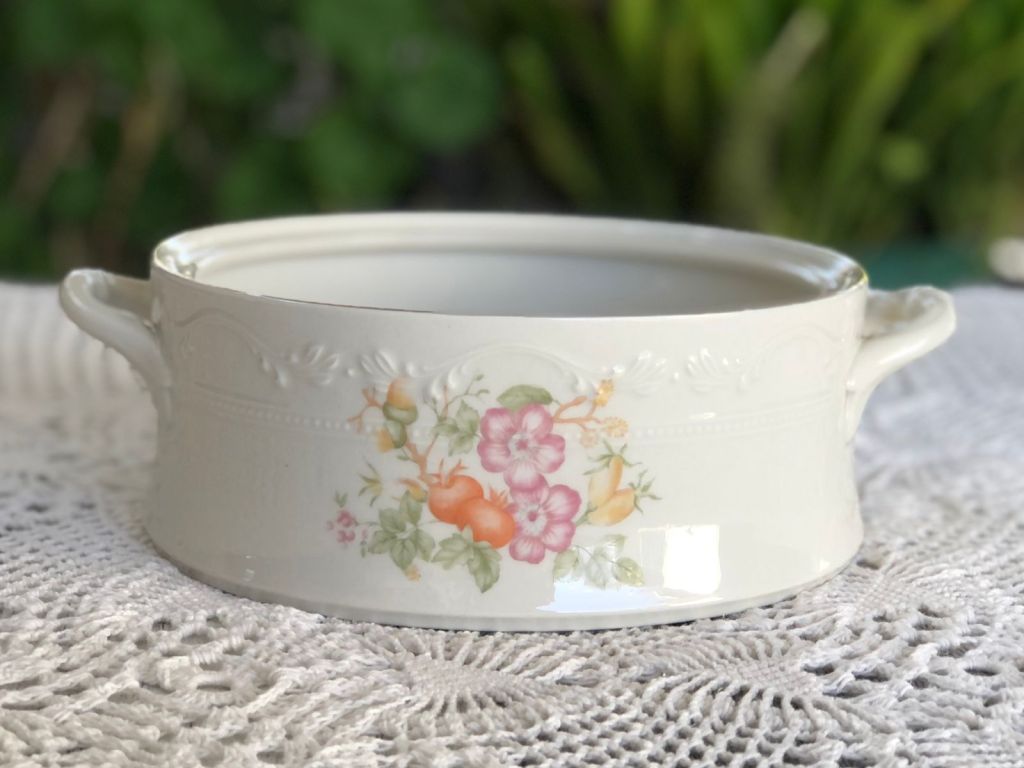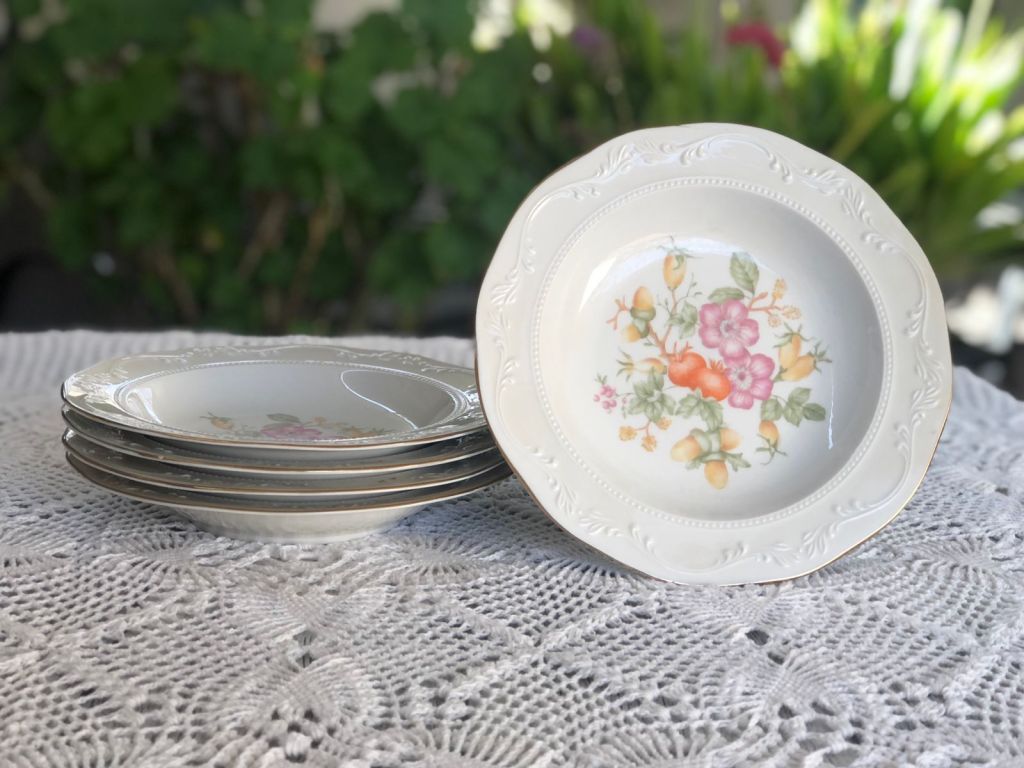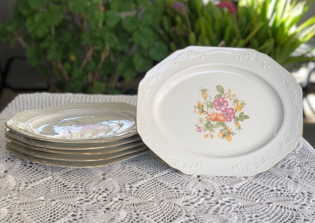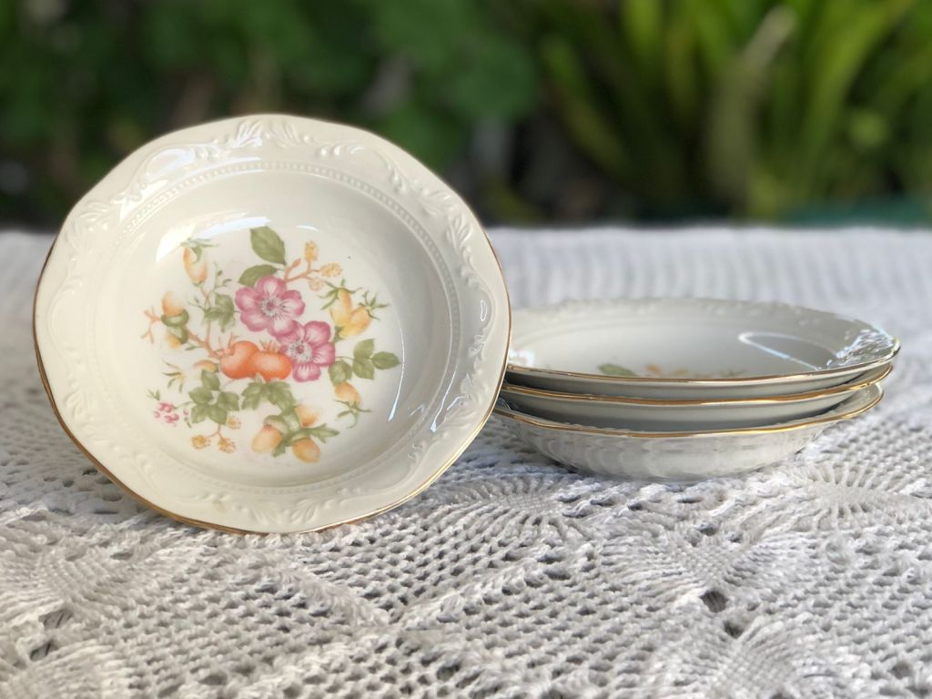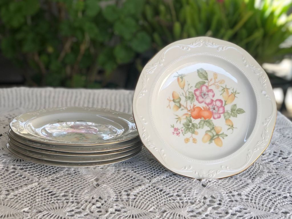 Another lovely cream crockery set with floral with fruit print and gold rim. The dinner set contains the typical embossed leaf and flower motif on the outer part of the plate.